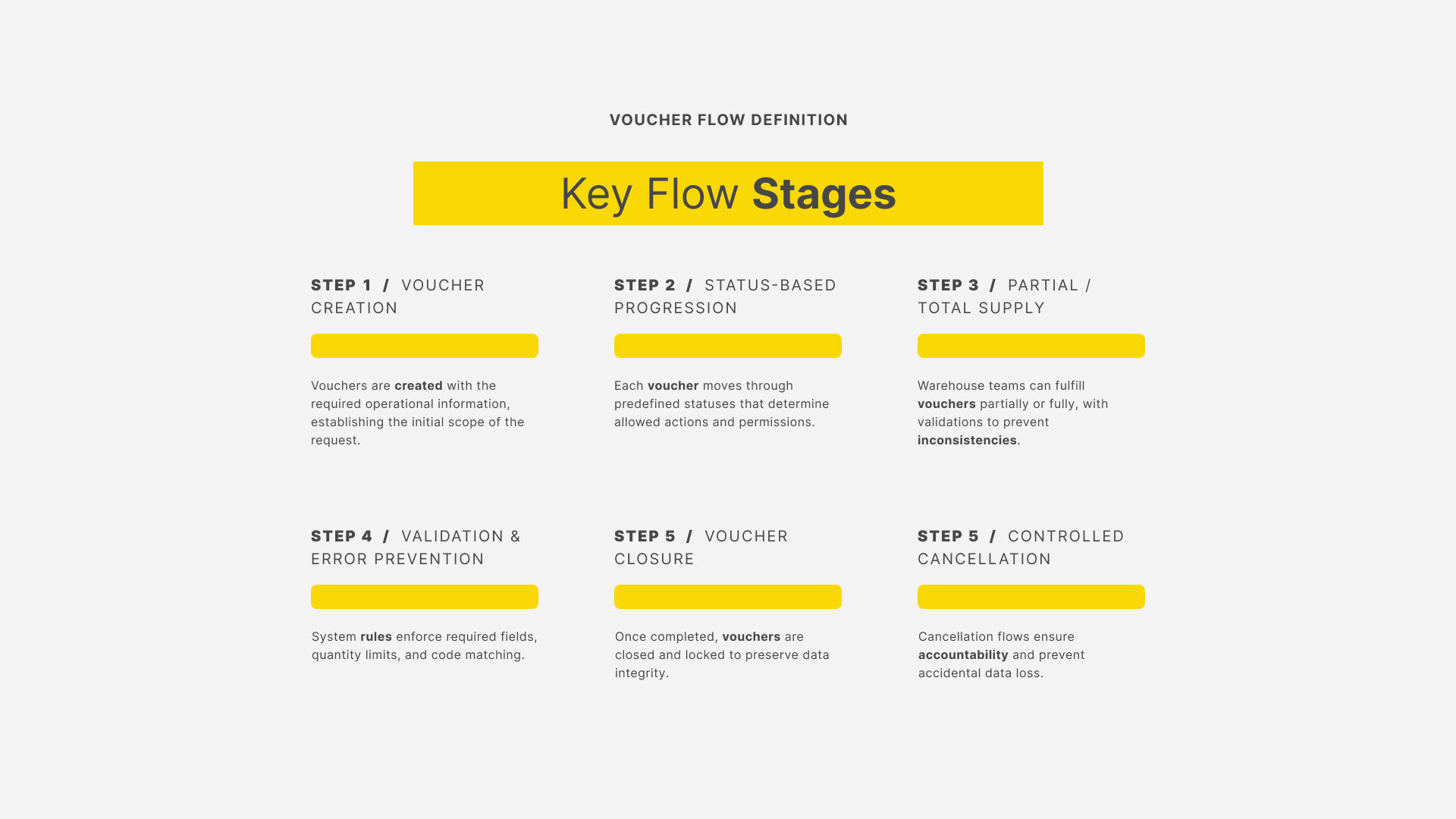 This project focused on designing a centralized internal system that supports the full voucher lifecycle through clear workflows, role-based access, and validation rules. The solution improved visibility across teams, reduced operational errors, and established a scalable foundation for long-term control and reporting.